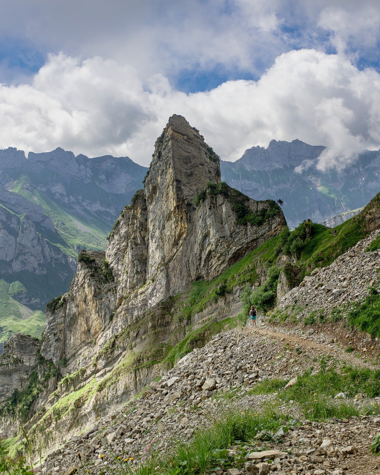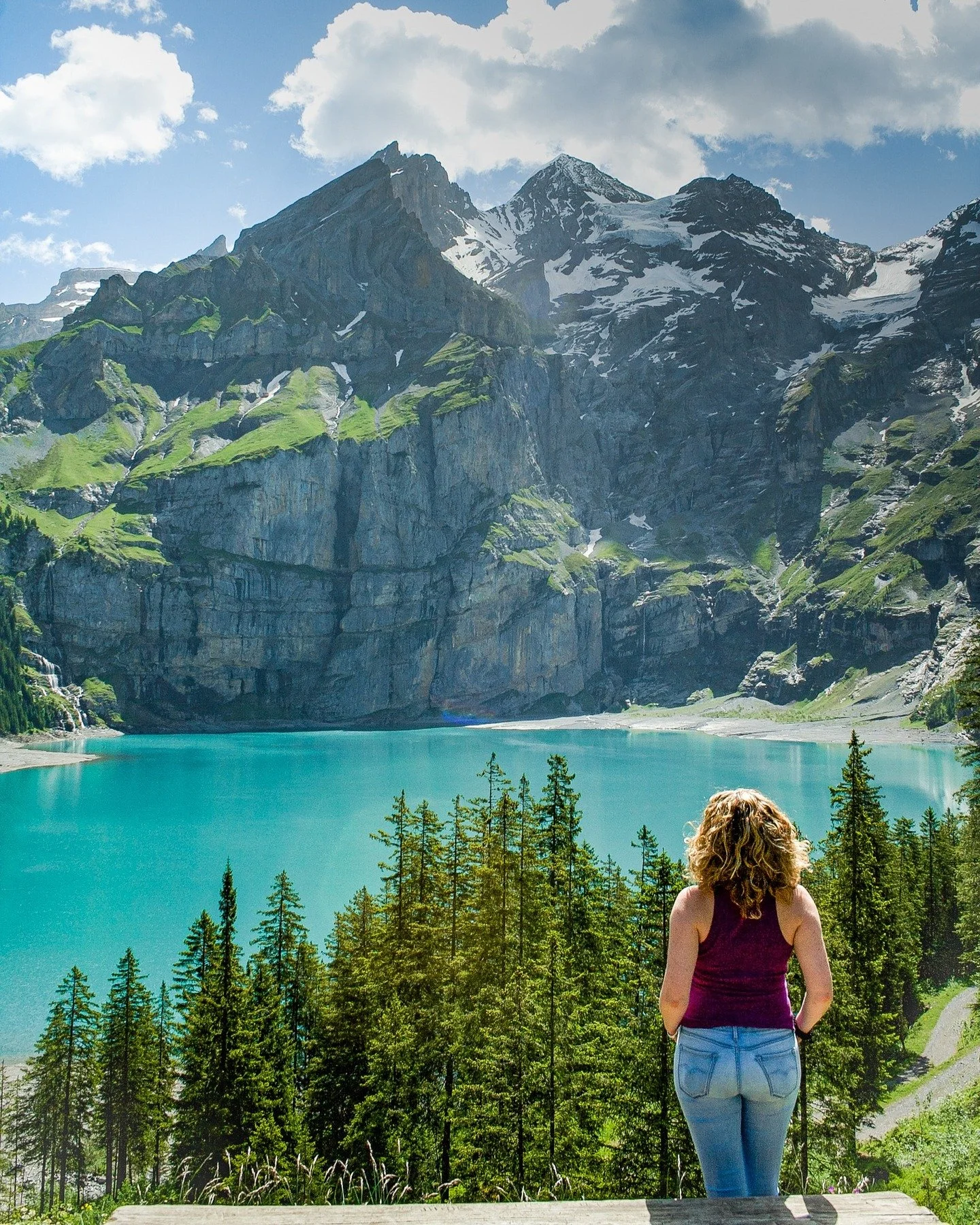 One of my favorite hikes in Switzerland is the Oeschinensee panorama hike. Simply because the views around this mountain lake are insane. Every corner you turn, offers a different stunning view. From the vivid turquoise of the lake, to the enormous mountains towering over you and even some waterfalls. It blew my mind.